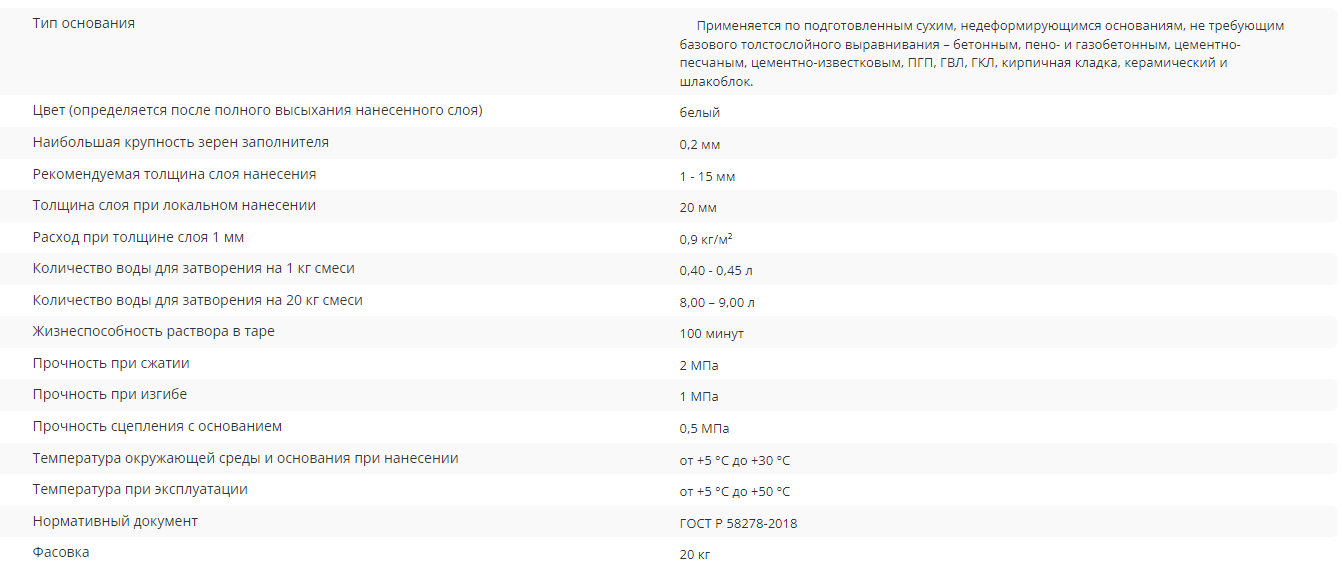Внутри сухих отапливаемых помещений для толстослойного и финишного выравнивания (слой от 1 до 15 мм) поверхности стен и потолков под дальнейшую отделку обоями и нанесения финишных декоративных покрытий; для заделки трещин, выбоин, раковин слоем до 20 мм, для заполнения швов ГВЛ, ГКЛ с обязательным применением армирующей ленты.